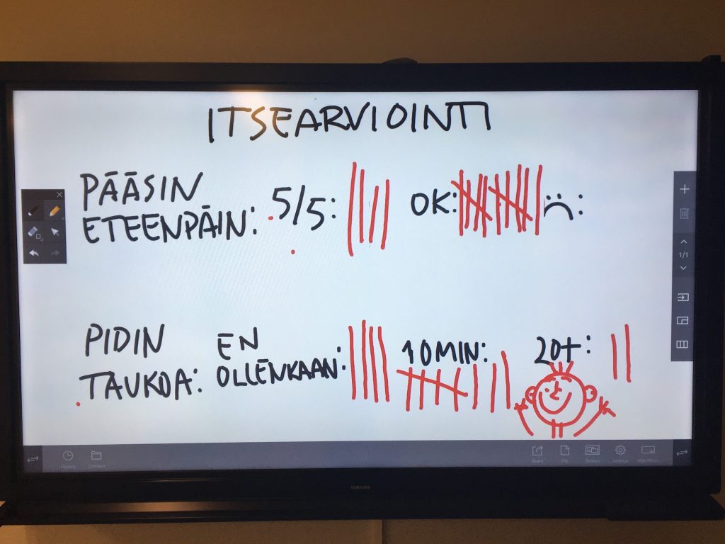 Oppilaiden itsearviointia älytaululla projektissa etenemisessä ja työpanoksessa. Kuva: Jere Linnanen